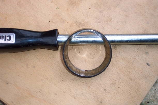 Removing the borrum race from the frame is fun. Rather than using the Haynes method of using a drift from the top, I found it easier to insert prybar from below into the lip on the race and then feed down a 30mm (or 31mm) with extension bar through the stem and tap (whack) on the pry bar face. That way you don't need to press on the upper race at all with the drift and can tap evenly all the way round.