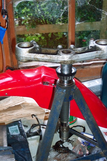 EDIT: Dunno if I'd fancy doin bearings out in the road. This is the kinda job where the Abba stand or similar saves you a whole load of faffin arooond trying to support the bike. The tools I needed were large hammer, Abba Stand, Pry bar (or any tool with strong large flat face), freezer, 30/31mm socket and ext bar (for driving out old races), bottom section of an axle stand (perfect diameter for driving on the lower race) and a homemade puller to pull the races in straight.