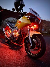 spyball alarm/immob, bluespot brake calipers and Stainless hoses, Fournales air adjustable shock with Remote Resevoir, forks raised 10mm thru yokes, racetech linear fork springs in 15 wt oil, Kappa wingrack/luggage, heated grips, Kedo handguards, dual heat controller to power heated jacket liner and or pants!!, Stebel 136DB horn, K&N air filter, colour matched Baglux tank cover (magnetic tank bag modified to fit cover), osram +50% headloight bulbs, headlight protector,"NitramSpecial" parking loight, tail light indicators all running on LED's & incorporate "Lite Buddies", MK7 Scottoiler fitted, taller screen, 2-2 stainless steel CCC's, Devil stainless down pipes. MKI Renntec engine crash bars & sump guard.